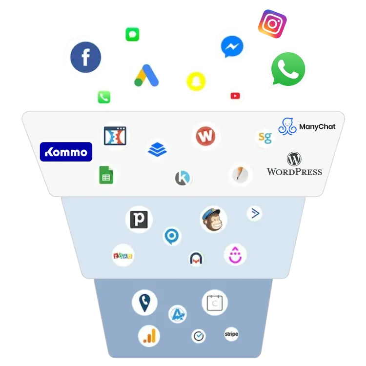 Com a nossa solução automatizada, você cria funis, landing pages, atendimeto completo com CRM integrado, pipelines, área de membros, pagamentos, e-mail marketing, whatsapp, redes sociais, pagamentos, agentes de IA e muito mais.